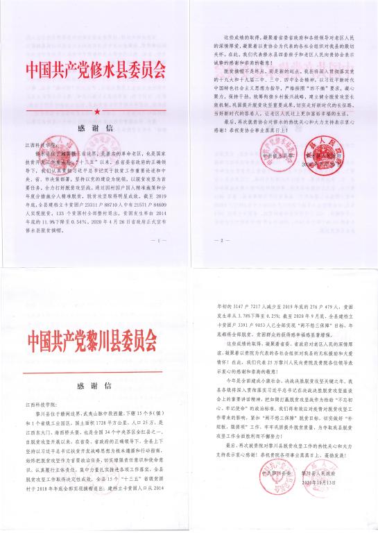 学校于2019年7月向修水县太阳升镇坳头村捐赠了14万元,用来建设集图书室、产业培训间、会议室、休息室、卫生间、厨房、红白喜事厅等于一体的村民活动中心。通过因村因户因人精准施策和“分年度分措施分人”精准脱贫,2020年4月26日省政府正式宣布修水县脱贫摘帽。2020年6月,学校采购了黎川县德胜村精准扶贫农产品,为脱贫攻坚贡献一份力量,也缓解了疫情给当地带来的临时困难。6月11日、12日,工会办公室副主任刘国安代表学校随扶贫团深入抚州市黎川县开展“党建+百社解千难”活动。通过项目实施、消费扶贫等方式,助力当地脱贫攻坚。截至2020年9月底,在我校和相关社会组织的共同努力和帮助下,抚州市黎川县建档立卡贫困户已全部实现“两不愁三保障”目标,年底将全部脱贫,贫困群众获得感幸福感显著增强。