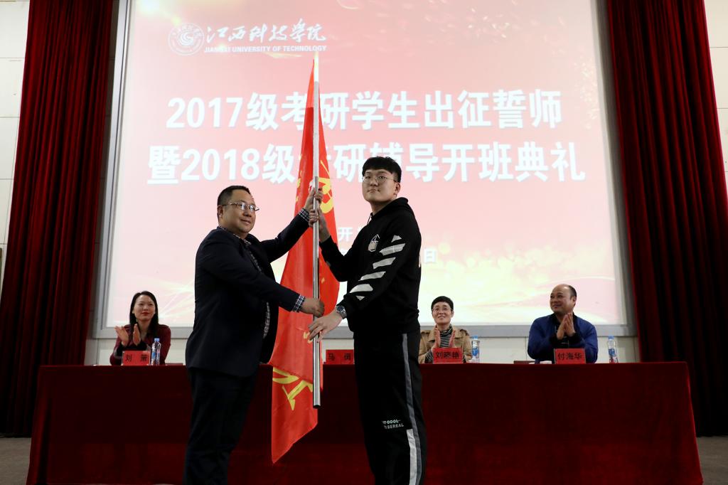 典礼在全体齐唱校歌《同一片蓝天》中拉开帷幕。马勇为2018级考研辅导班代表授旗并讲话。他指出,我校考研工作取得成绩,在于组建了一支水平较高的考研辅导队伍;探索了一套行之有效的辅导管理机制;培养了一批优异的考研学生典型;营造了一种积极向上浓厚的考研氛围;正在努力打造一个具有江科特色教育的考研品牌。就继续做好考研工作,马勇要求各学院进一步宣传典型,鼓励学生考研;各部门进一步通力合作,积极支持考研;辅导教师进一步加强教学研究,提高辅导水平;开发处进一步精细化管理,提升服务能力;考研学子坚持刻苦学习,保证学习效果。他还以自身为例讲述了通过考研改变人生命运的故事,鼓励学生考研,寄语大家考研马到功成,梦想成功。