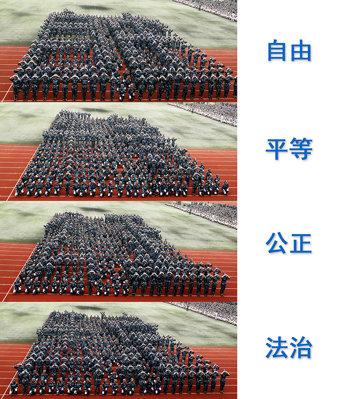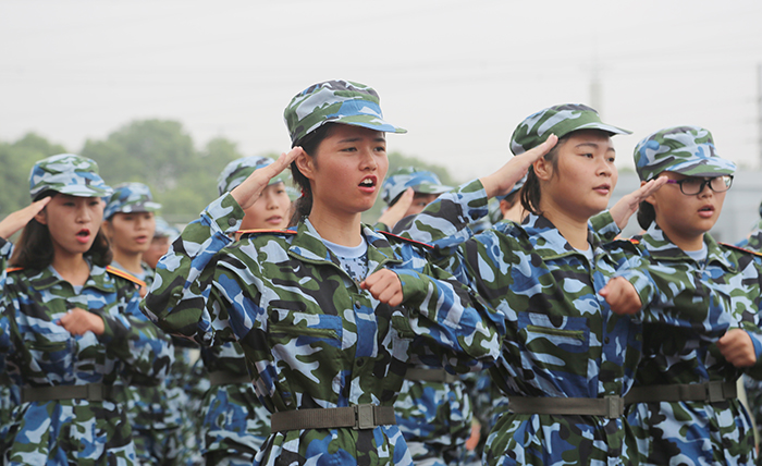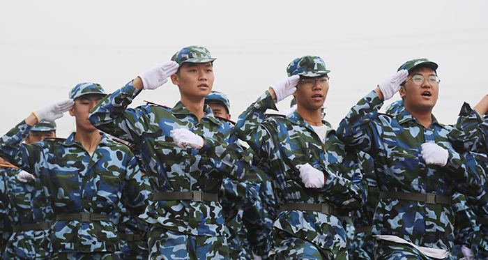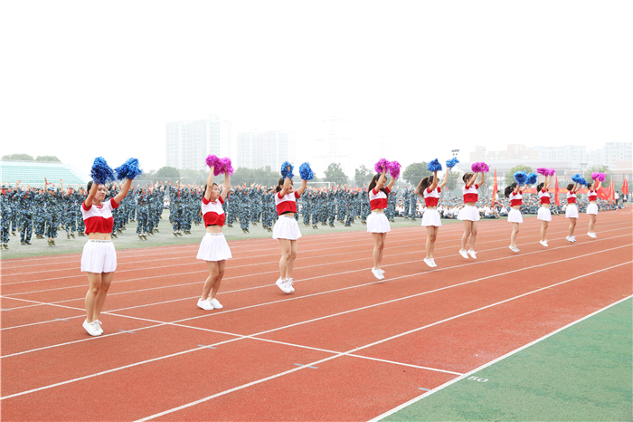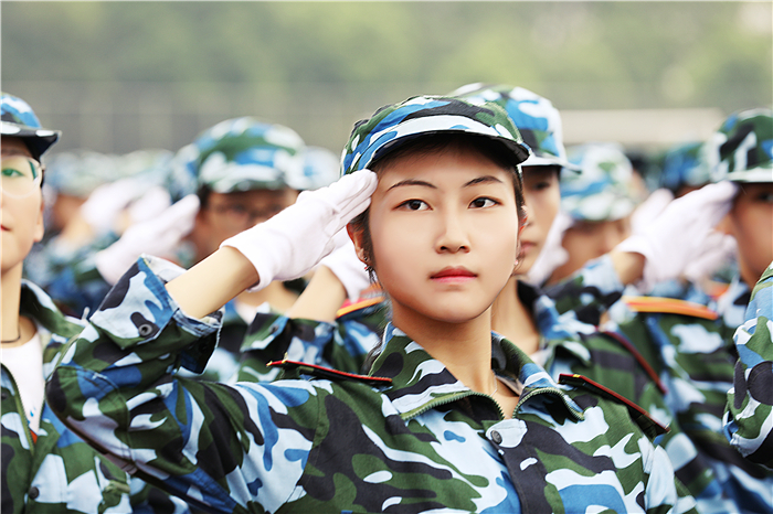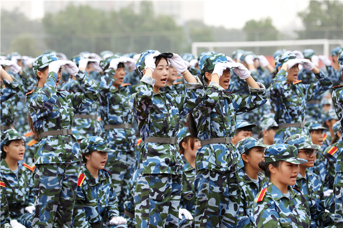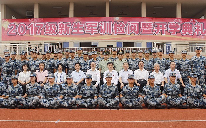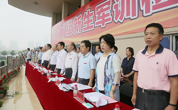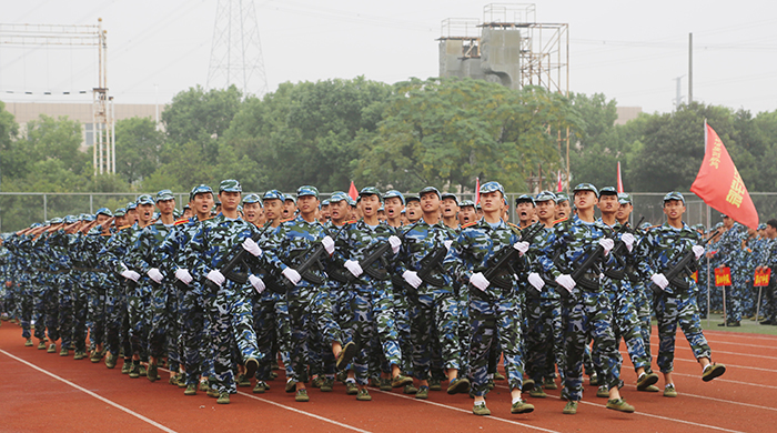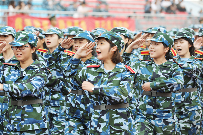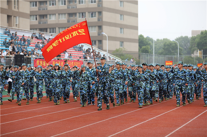 一个个方阵队在各学院院旗引领下依次接受检阅。2017级新生们精神抖擞,意气风发,喊着嘹亮的口号,迈着矫健的步伐依次通过主席台前。他们整齐的队列、挺拔的军姿展现了军训的丰硕成果。
