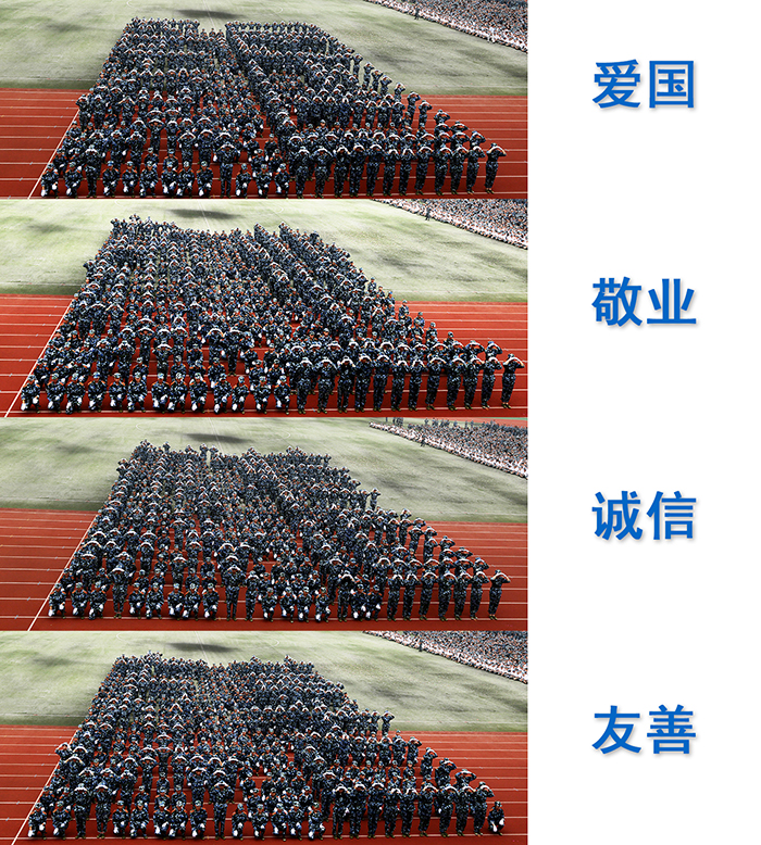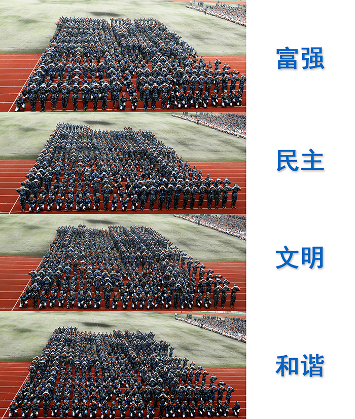 随后,艺术设计学院带来歌舞表演《逆战》和《歌唱祖国》,文化与传媒学院带来舞蹈《新时代的力量》,展现了2017级新生的活力与热情。本科新生方阵队用精彩的方阵表演展示了社会主义核心价值观,创意十足,让人眼前一亮。同学们精彩的表演博得全场阵阵掌声。