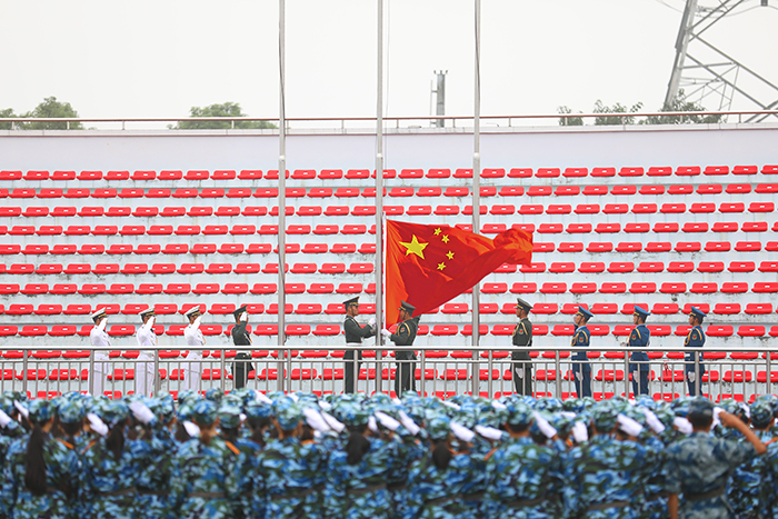 8时整,庄严的国歌声中,五星红旗冉冉升起。随后,于果宣布检阅开始。