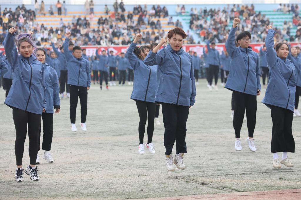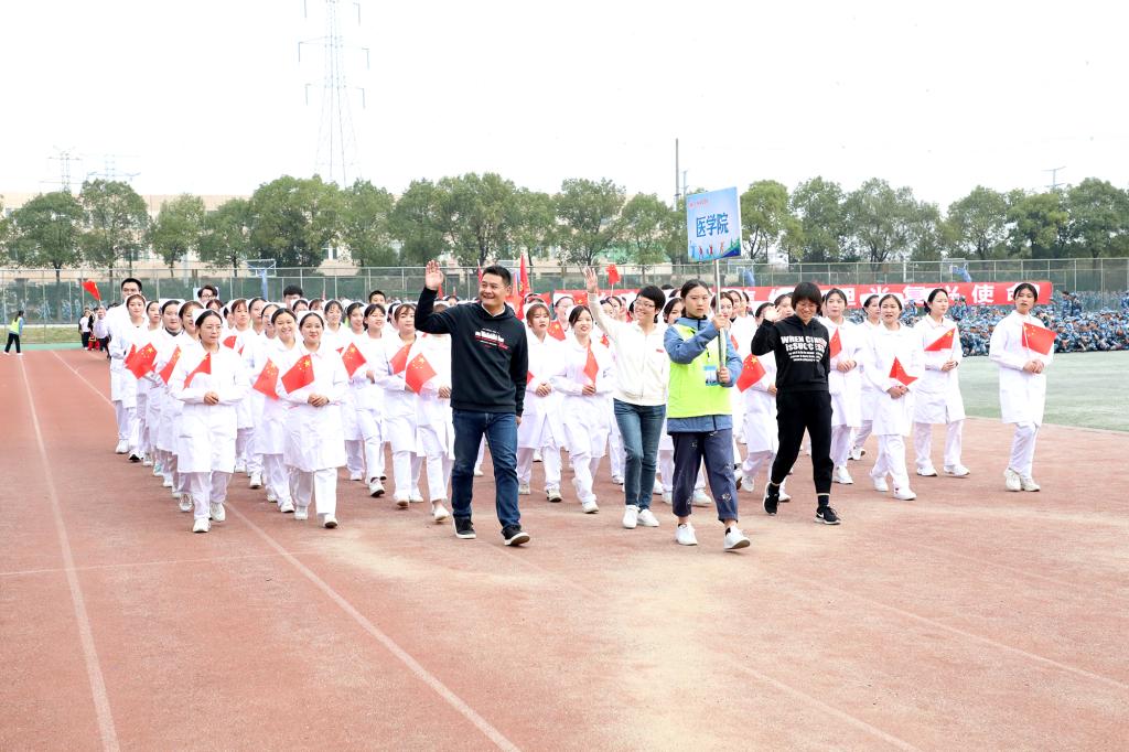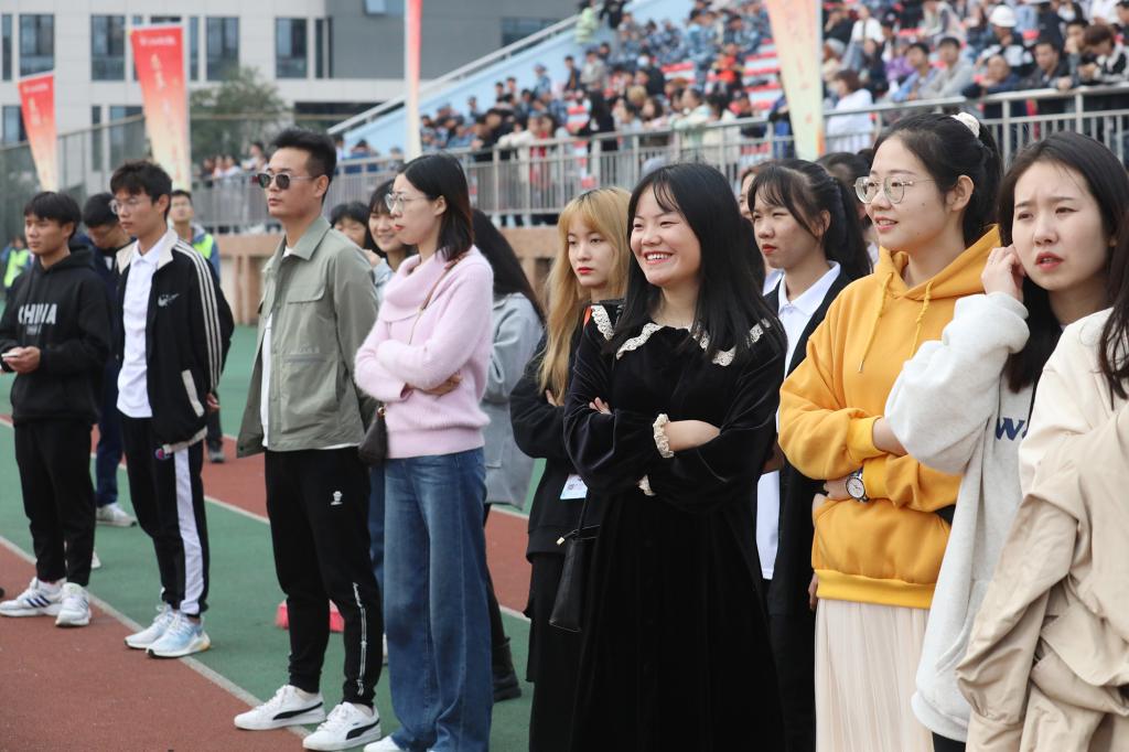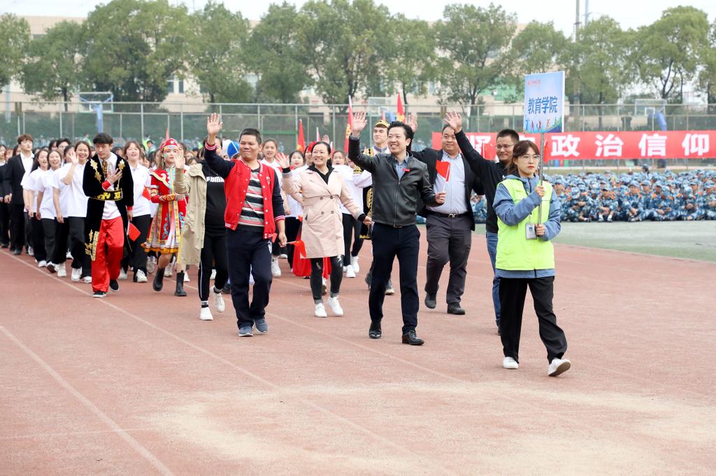 于果宣布学校第二十一届校运会正式开始。在激昂的运动员进行曲中,裁判员队伍和智能工程学院、信息工程学院、城市建设学院、管理学院、财经学院、外国语学院、艺术设计学院、音乐舞蹈学院、医学院、文化与传媒学院、教育学院等学院师生代表队带着满腔的热情,昂首阔步从主席台前经过。