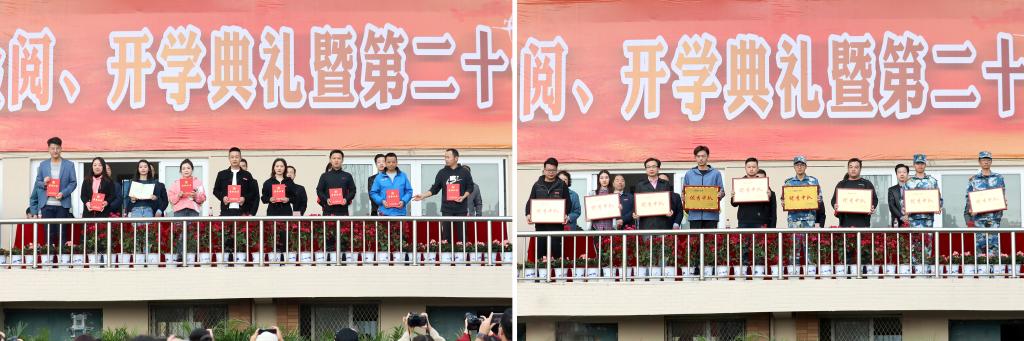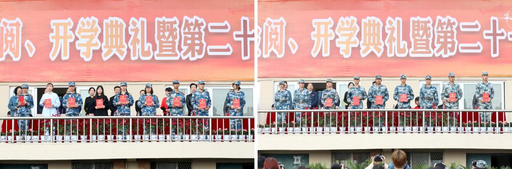 闵桂林宣读《关于表彰2020年新生军训工作先进集体和先进个人的决定》。校领导向受表彰的集体和个人颁奖。