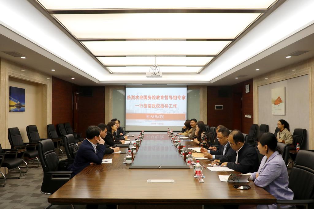 江科网讯(记者 何强江)11月16日上午,由国家教育行政学院党委书记、常务副院长侯慧君为组长的国务院教育督导组专家一行来校督查指导工作。校长张海涛,党委副书记、副校长黄辉玲、闵桂林,副校长马勇、周冰冰,纪委书记夏拥华等接待了督导组一行。张海涛代表学校对侯慧君一行的到来表示热烈欢迎。督查组专家通过座谈会、一对一访谈、校长深度访谈、实地考察、调取相关资料等方式开展督查工作。