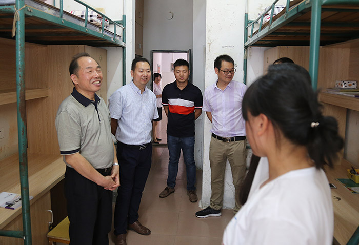 程样国和万哨凯走进宿19栋,查看了学生的住宿环境,并与同学们亲切交谈。程样国详细询问了同学们对新环境的适应情况以及军训的感受,勉励大家在校读书期间要互帮互助、共同学习、一同进步。他还与宿舍管理员亲切交流,详细了解了学生宿舍的管理制度。