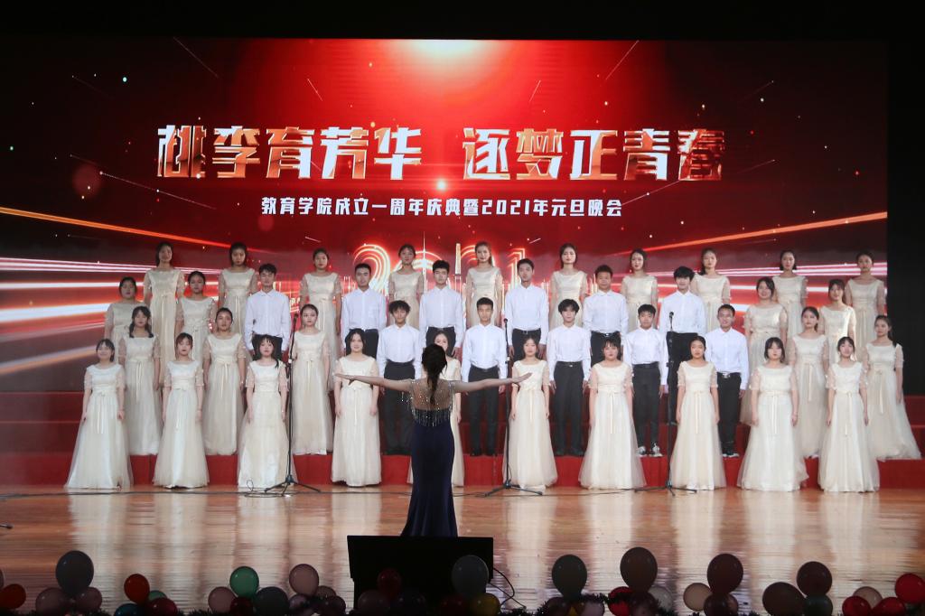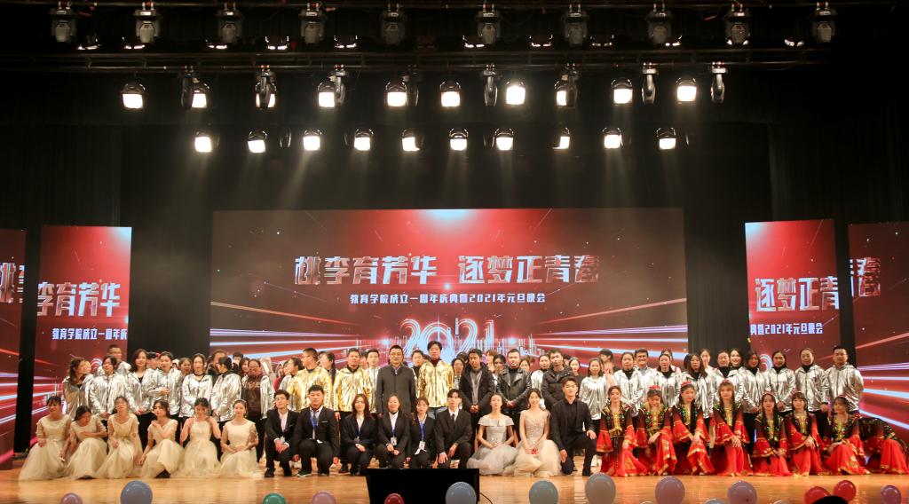 舞台上,教育学院师生载歌载舞,充满青春与活力,以积极昂扬的良好精神面貌谱写华美乐章,欢送2020,喜迎2021。