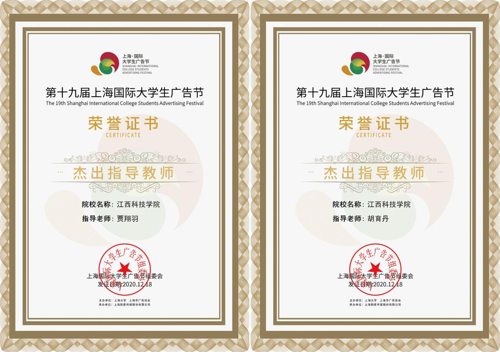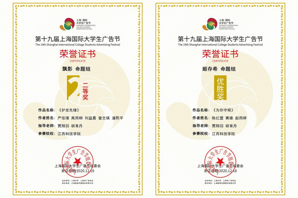江科网讯(通讯员 胡育丹)近日,第19届上海国际大学生广告节(以下简称“上海大广节”)总决赛暨闭幕式颁奖盛典圆满落幕。我校文化与传媒学院师生在直播总决赛中勇闯佳绩,2018级广播电视编导专业的严佳璟、高雨桐、刘益嘉、曾文瑛、潘熙平等学生创作的《护发先锋》荣获二等奖;陈红盟、黄臻、赵雨婷等学生创作的《为你守候》荣获优胜奖;贾翔羽、胡育丹老师获杰出指导教师、优秀指导教师;龚彦艳、谢爱民、郑艾倍、范蕾蕾、熊文君老师获创意指导教师,同时我校荣获本届上海大广节高校教育联盟荣誉称号。