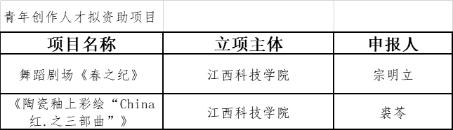 全省青年创作人才项目共立23项,我校获批立项2项。音乐舞蹈学院宗明立老师申报的舞蹈剧场《春之纪》项目获资助经费5万元;艺术设计学院裘苓老师申报的《陶瓷釉上彩绘“China红.之三部曲”》项目获资助经费5万元。