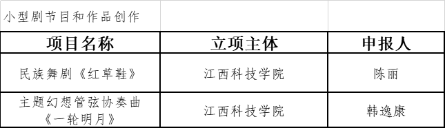 全省小型剧节目和作品创作共立16项,我校获批2项。音乐舞蹈学院陈丽院长申报的民族舞剧《红草鞋》项目获资助经费16万元;音乐舞蹈学院韩逸康老师申报的主题幻想管弦协奏曲《一轮明月》项目获资助经费12万元。