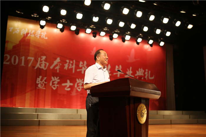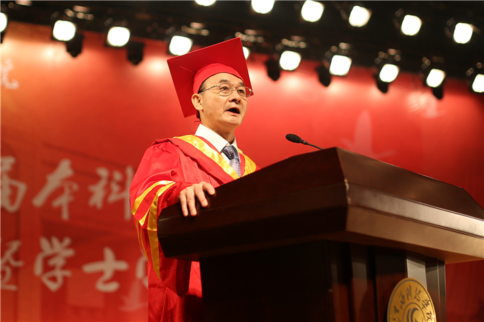 王海在毕业典礼上作了讲话,向顺利获得学士学位的同学们表示祝贺。他说,离歌唱罢,拨穗礼成,大家即将奔赴人生的又一个新的起点。在大学的最后时刻,他送给大家五句话。一是把伟大作为一生的追求。他希望大家以天下为己任,继承好江科精神,实干兴业。二是把创新作为一生的动力。要有强烈的创新冲动,要把握创新方法,要大胆开展创新实践。三是把学习作为一生的习惯。要贵恒、贵用、贵提高。四是把体育锻炼作为一生的爱好。要有适宜自己生理和生活规律的体育项目,运动有度,有一套科学的养生方法。五是把感恩作为一生的情怀。要感恩父母、感恩老师、感恩一切帮助过我们的人。最后,他祝福所有的毕业生能够成为伟大的人!
