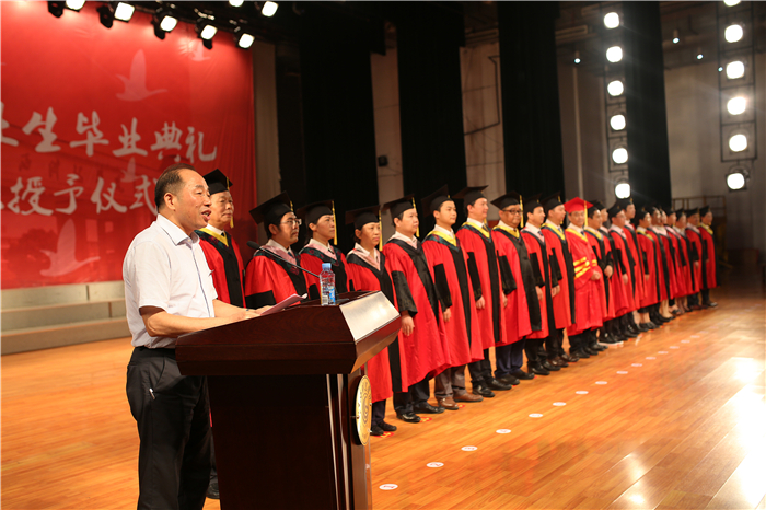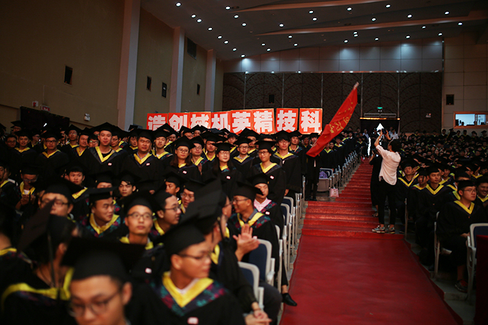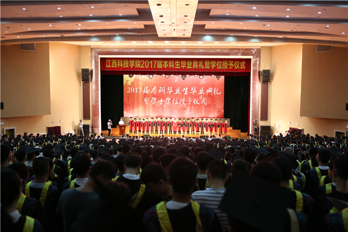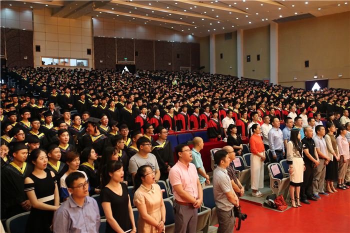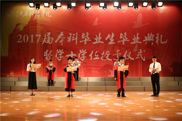 仪式开始,全场起立,校学位委员会全体委员在毕业生们的欢呼声和掌声中入场。全场齐唱校歌《同一片蓝天》。校学位委员会副主任胡剑锋宣读了学校《关于授予2017届本科毕业生学士学位的决定》及《2017届优秀本科毕业生评选决定》。校学位委员为优秀本科毕业生颁奖并授予学士学位。