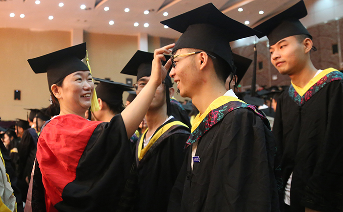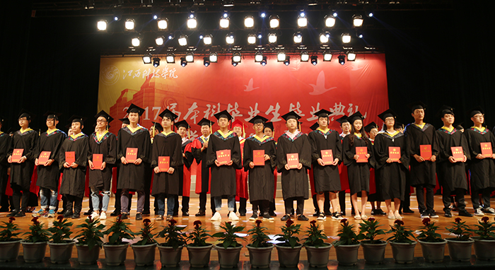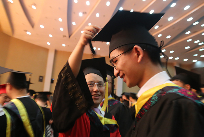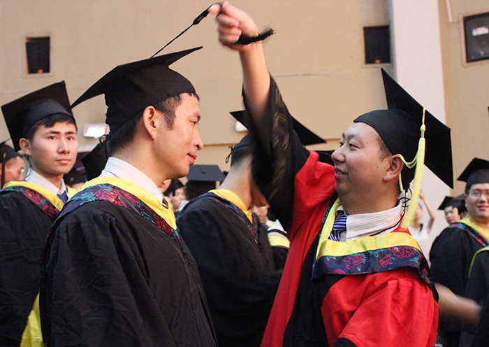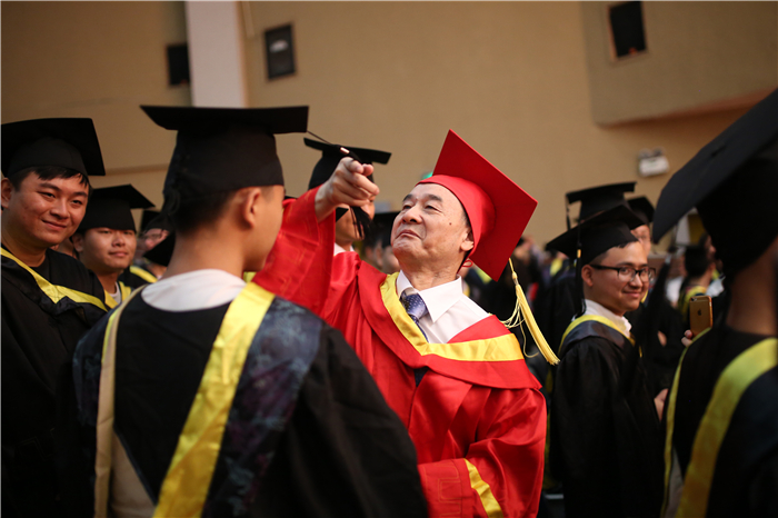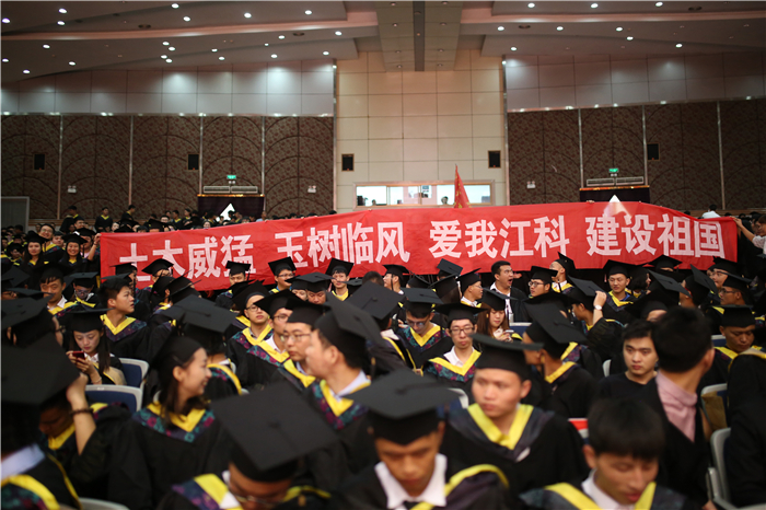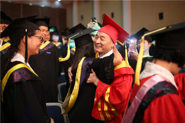 接着,学位委员们为全体本科毕业生授予学位。他们走到毕业生中间,为毕业生们一一拨正学士帽上的流苏,象征着又一批江科的本科学子学有所成,即将飞向更为广阔蓝天创造美好的未来。毕业典礼现场,同学们争相与培养自己的师长们合影、拥抱,浓浓的师生情令人动容。