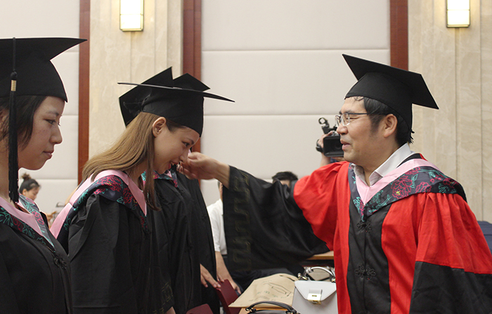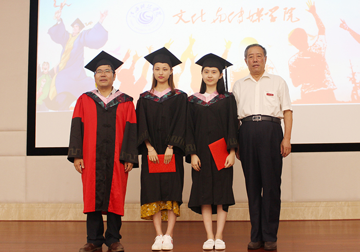 根和齐新林为优秀毕业生颁发了荣誉证书。学院学术委员为毕业生授予学士学位。齐新林在仪式上对学院首届本科毕业生顺利毕业表示祝贺,并希望大家在今后懂得感恩、学会应对、感受快乐。优秀毕业生代表2013级新闻专业江雨晴上台发言,感谢学院四年来的用心栽培。仪式上还播放了毕业短片,让同学们倍感温暖。