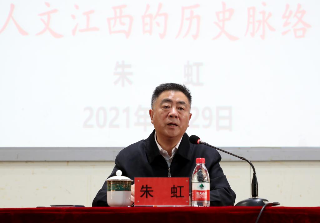 朱虹教授在讲座中从江西历史文化的四个发展阶段讲起,生动形象地讲述了“从万年到豫章”、“从边缘到中心”、“从全盛到低谷”和“从蛰伏到潮头”等一个个充满特色和魅力的历史发展阶段,多视角、全方位地展现了从江西文化载体的形成,经历江西文化的高峰、衰退到江西红色文化兴起的历史画卷。结合翔实的文字和图片资料,他阐述了书院文化、陶瓷文化、茶业文化、药业文化、稻作文化、造纸文化、矿冶文化、风水文化、宗教文化和商帮文化等江西十大文化。通过引用大量的经典论述和事例,朱虹教授讲述了隐逸诗人之宗陶渊明、宋词奠基人晏殊、宋代文坛领袖欧阳修、中国11世纪改革家王安石、“江西诗派”开山鼻祖黄庭坚、一代诗宗杨万里、理学的集大成者朱熹、千古忠臣文天祥、大明第一才子解缙和戏曲巅峰汤显祖等江西十大名人的故事和成就。