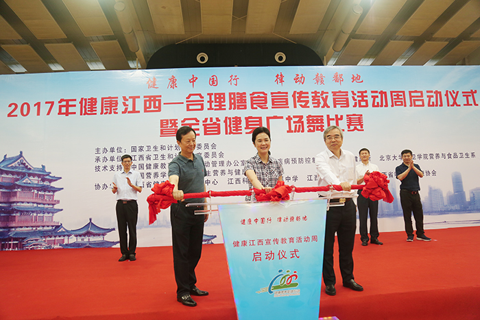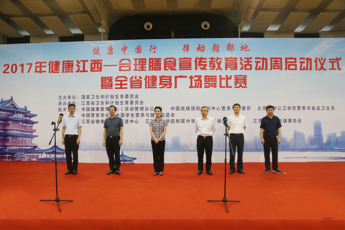 江科网讯(记者 薛敬涛)6月25日上午,由国家卫计委主办,江西省卫计委承办的“健康中国行 律动赣鄱地”2017年健康中国行——合理膳食主题宣传教育活动周启动仪式在江科附中飞扬体育馆举行。江西省人民政府副省长谢茹出席活动,国家卫计委宣传司司长毛群安致辞,江西省卫计委党组书记、主任丁晓群,中国健康教育中心主任马爱宁,江西省卫计委党组成员、副主任朱烈滨,江西科技学院董事长于果等出席启动仪式。