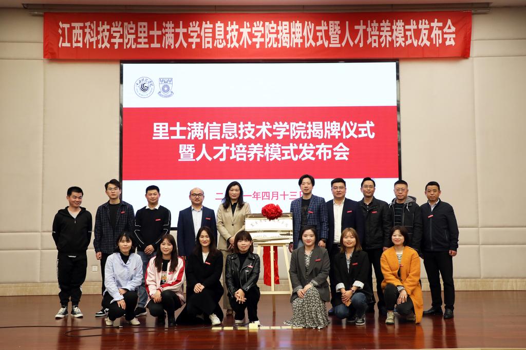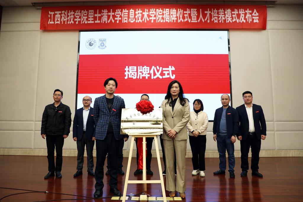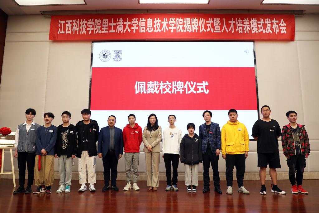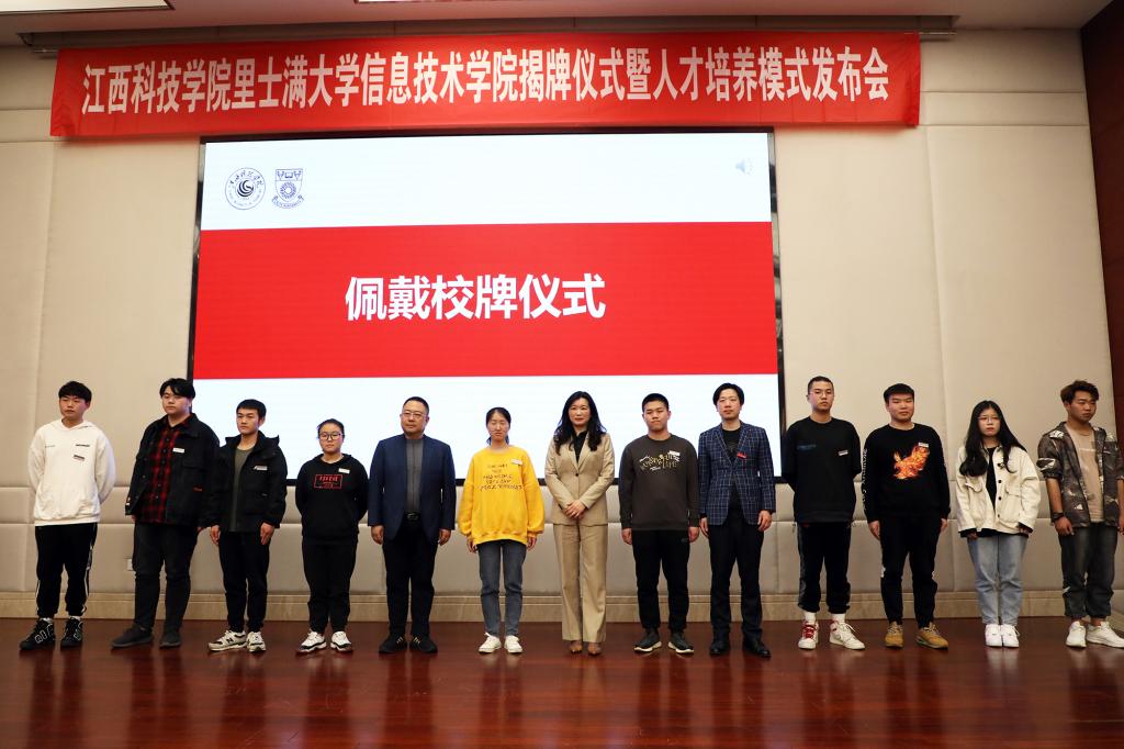 会上,张海涛校长和李玮副校长为里士满信息技术学院揭牌。与会领导为里士满信息技术学院学生佩戴校牌。
