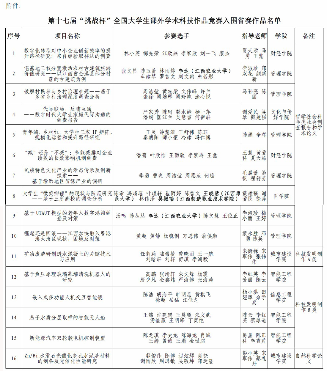 附件:江西科技学院第十七届“挑战杯”全国大学生课外学术科技作品竞赛入围省赛作品名单