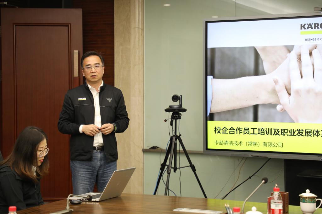 刘吉清总经理在会上详细介绍了卡赫公司的整体情况,阐述校企合作共建模式。卡赫中国区HRD人力资源发展总监黄海涛就在校学生企业职业通道及发展方向进行发言。