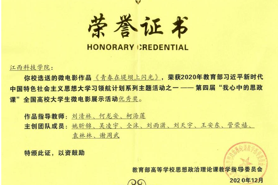 江科网讯(通讯员 刘清林)由教育部高等学校思想政治理论课教学指导委员会主办,武汉大学马克思主义学院承办的第四届“我心中的思政课”全国高校大学生微电影展示活动于近日公布了比赛结果。我校2017级、2018级文化与传媒学院新闻学、广播电视编导专业学生积极参赛,在思政部刘清林、何龙安、柯海莲三位教师的指导下,姚昕锦、吴凌宇、仝沫、刘雨潇等同学的作品《青春在堤坝上闪光》荣获优秀奖。