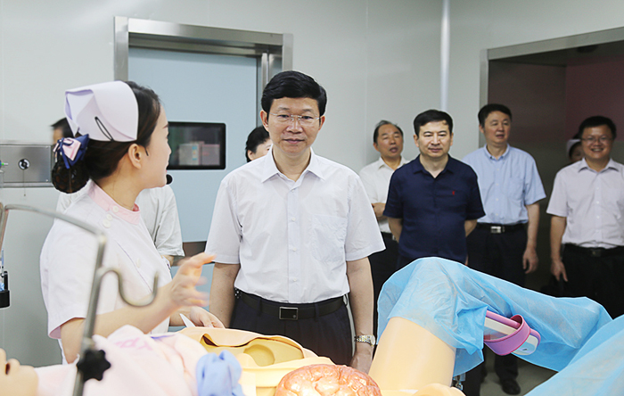 在学校护理学院,李利参观了学院实训室,了解了护理专业学生的学习、就业情况。他对“学院设病房、病房设课堂”的全真模拟教学模式表示肯定,对学院的应用型人才培养方式表示认可。他指出,学院教学规范,培养的学生操作能力强,一定会培养出更多医院需要、社会信赖的白衣天使。