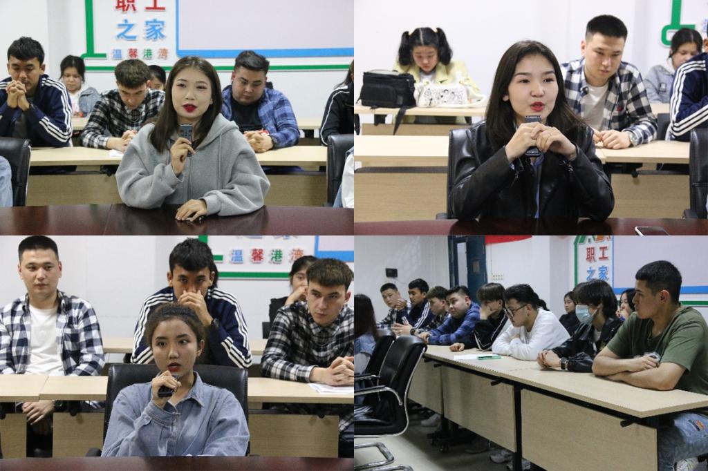 会上,班主任哈孜别克、辅导员王婷、学生代表迪丽胡玛尔和热衣汗古丽分别作表态发言。现场交流环节,师生围绕专业选择、大学生活和创业等话题展开互动讨论。