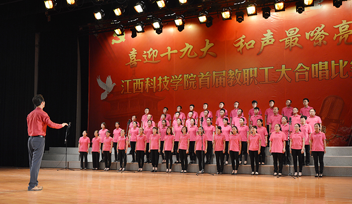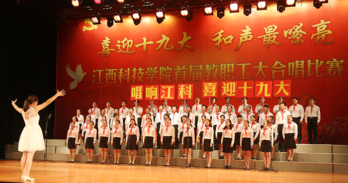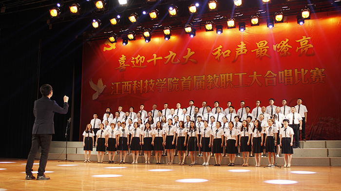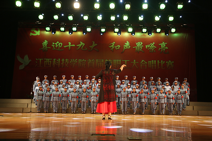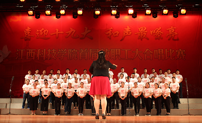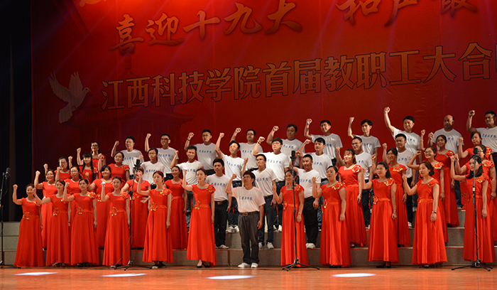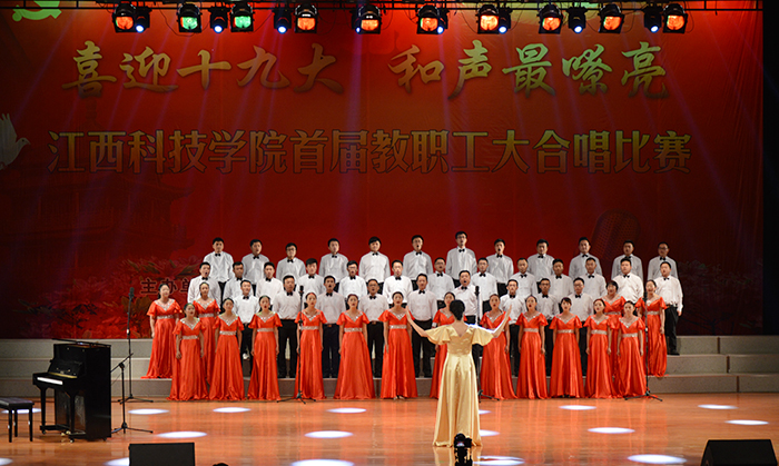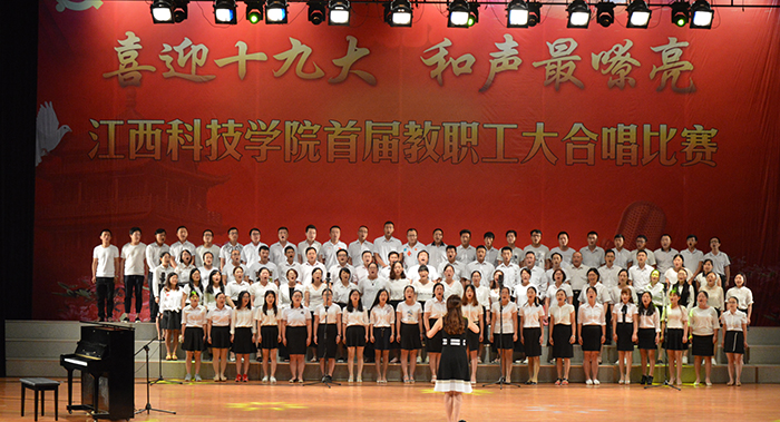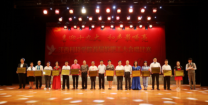 江科网讯(记者 李倩)6月15日晚,蓝海大剧场灯光璀璨,“喜迎十九大 和声最嘹亮”——江西科技学院首届教职工大合唱比赛在这里隆重举行。于果董事长、程样国书记、王海校长、肖