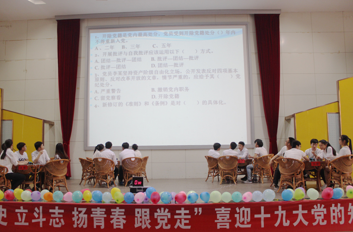 本次比赛分两轮进行,内容包含必答题、抢答题、限时答题、风险题等环节,题目涉及党章、时政、文学、常识等类型。12个学院经过两个多小时激烈的角逐,最终外语外贸学院获得冠军,财经学院获得亚军,土木工程学院获得季军,管理学院获得优秀团队。出席活动的嘉宾为获奖的集体和个人颁发了奖牌与荣誉证书。校党委组织部魏芳老师,校党委宣传部毛振东、李玉云老师,校团委路丕军、余兴老师应邀担任比赛评委。