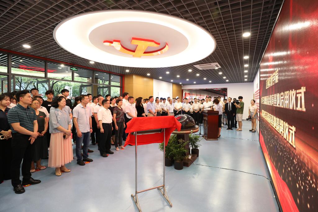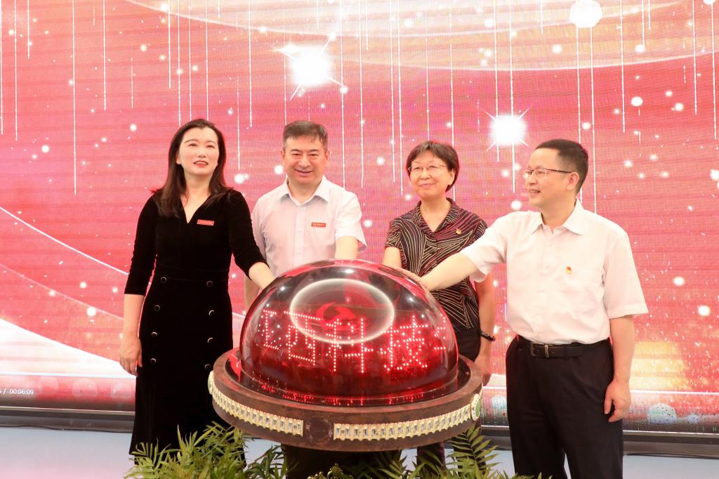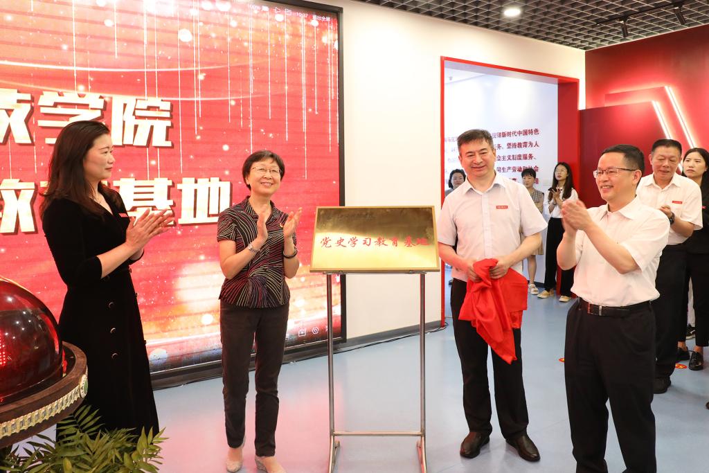 在热烈的掌声中,胡新明组长与于果董事长、邓弘书记、张海涛校长共同启动发布球,并为党史学习教育基地揭牌。