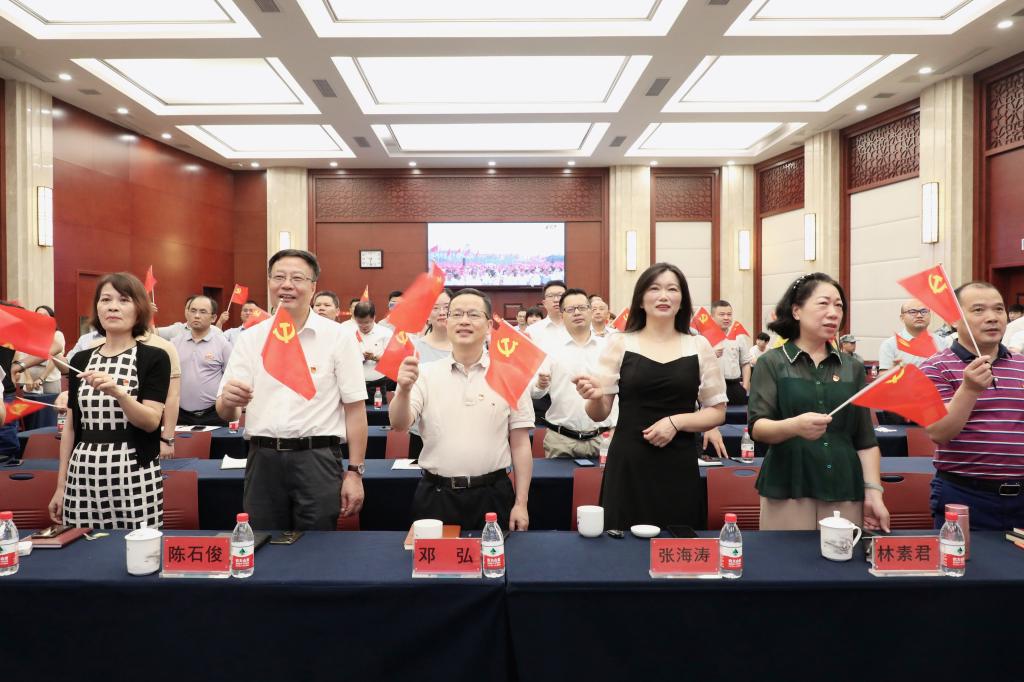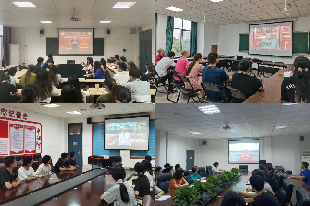 校党委书记邓弘,校长张海涛,副校长陈石俊、林素君、黄辉玲、闵桂林、马勇、周冰冰,总督学程样国,顾问熊爱民等在校校领导同各单位、各部门负责人,各学院党总支书记、教工党支部书记、学生党支部书记,党委各直属党支部书记,机关各党支部书记,民主党派、无党派人士代表,师生代表在行政南一楼第一会议室集中收看电视直播,共庆中国共产党百年华诞。学校高度重视,根据安排,各二级党组织、校属各单位组织师生通过广播、电视、手机、网站等方式认真收听收看大会盛况。