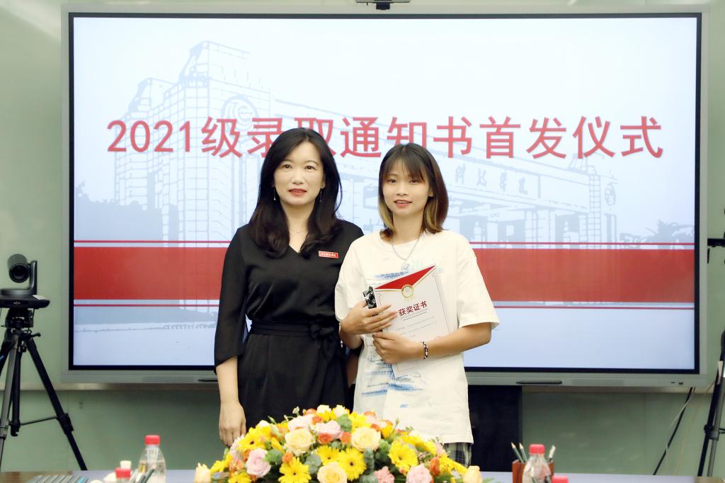 仪式上播放了2021年录取通知书介绍视频,展现整体通知书的样式及细节。马勇副校长宣布我校首届录取通知书设计大赛获奖名单。张海涛校长为大赛冠军艺术设计学院2018级视觉传达专业的严阳艳同学颁发奖杯及荣誉证书。严阳艳同学现场介绍获奖作品《云霞出海曙》的设计历程及理念。