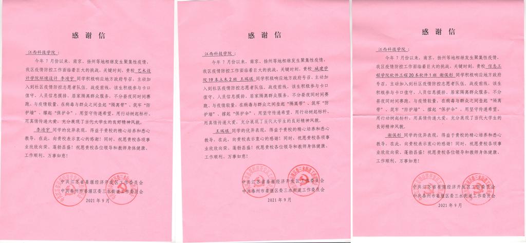 江科网讯(记者 刘莹)近日,我校收到中共江苏省姜堰经济开发区工作委员会、中共泰州市姜堰区委三水街道工作委员会联合发来的三封感谢信,信中对我校信息工程学院谢俣彤同学、城市建设学院王瑞琪同学、艺术设计学院李靖宇同学勇敢逆行、积极参与社区疫情防控工作提出表扬和感谢。来信充分认可三位同学作为当代大学生的责任与担当,同时也肯定我校的教育培养工作。