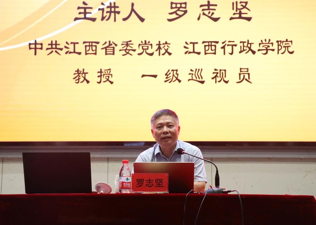 江科网讯(记者 李倩)9月12日上午,学校特邀中共江西省委党校、江西行政学院一级巡视员罗志坚教授作题为“贯彻落实新十六字方针,助力推进全面依法治国——习近平法治思想学习体会”的学术报告。罗志坚教授兼任中国法学会会员,江西省法律顾问团专家成员,江西省法学会副会长、学术委员会副主任。罗教授在江西省委党校从事干部教育培训和法学教研工作三十五年,侧重于职务犯罪预防、作风建设和依法治国等理论与实务的教学与研究。在《中国法学》《求实》等刊物上发表学术论文50多篇;在省内外党政机关、企事业单位和大专院校等各类市厅级、县处级干部培训班开设了《习近平法治思想学习纲要》《依法治国的理论与实践》《法治思维和法治方式》《职务犯罪的预防》等20多个专题课程。
