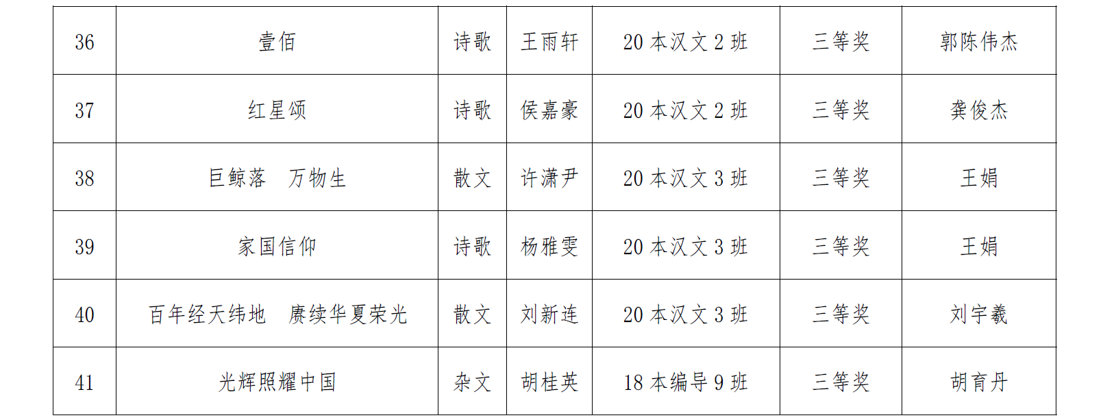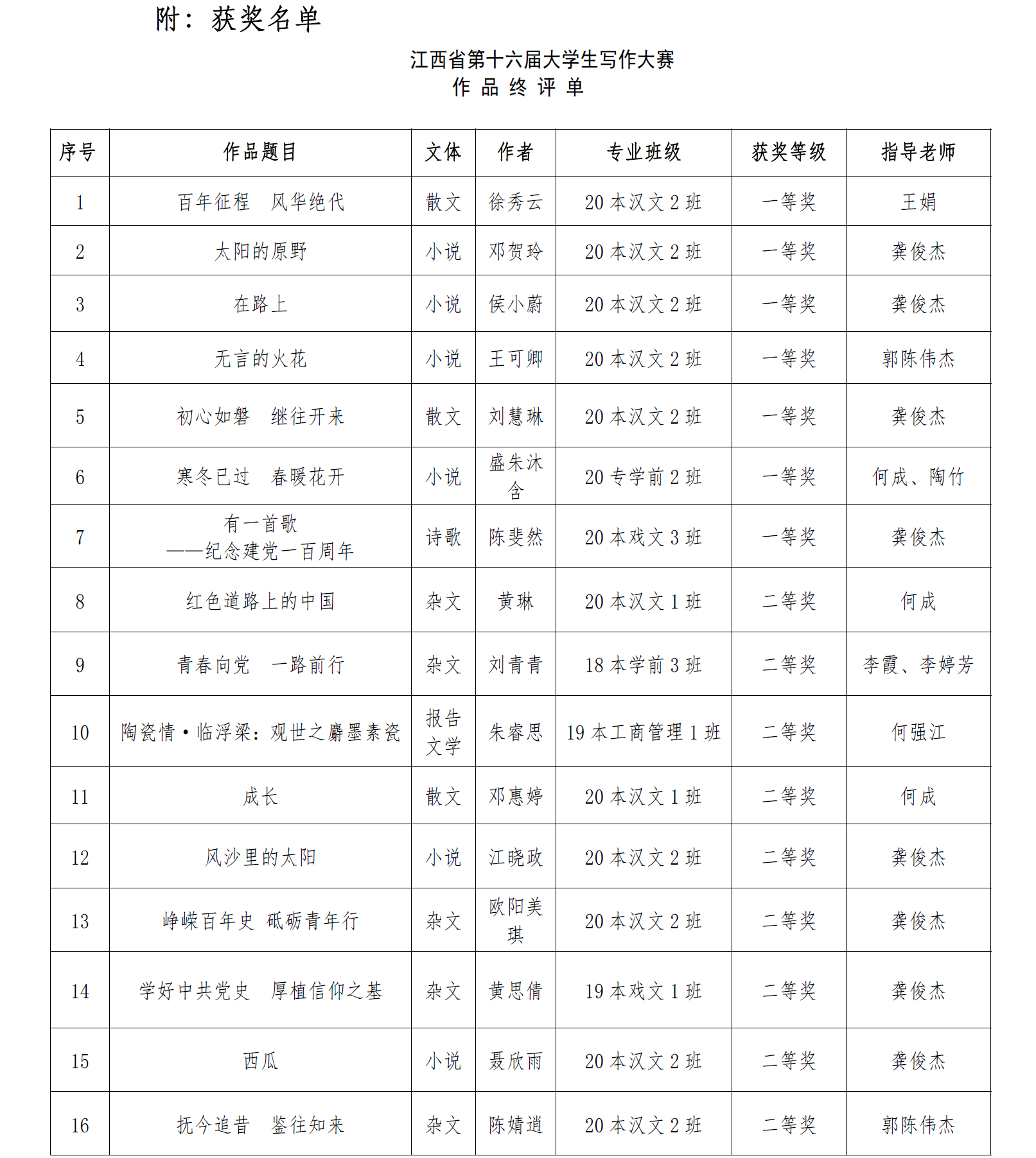 江科网讯(通讯员 龚俊杰)近日,从江西省写作学会获悉,在江西省第十六届大学生写作大赛中,我校41篇参赛作品获奖,其中一等奖7篇、二等奖15篇、三等奖19篇。龚俊杰、王娟、何成、郭陈伟杰等四位老师获优秀指导教师称号。