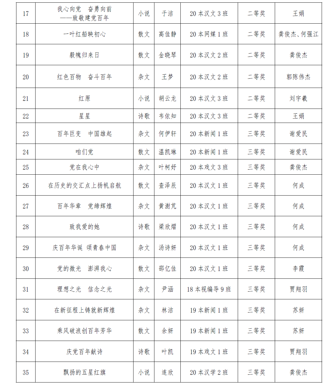 据悉,这是我校首次参加全省大学生写作大赛。本次大赛,学生踊跃参与并取得优异的成绩,作品体裁包括散文、杂文、书信、微型小说、辞赋和诗歌等。此次大赛主题为“致敬建党百年,讴歌时代芳华,赓续奋斗传统,描绘锦绣江山,绽放青春光彩,彰显后浪精神”。来自省内外各大高校的近上千篇作品参加了角逐,经江西省写作学会评审组专家审定,获奖作品题材丰富,体裁多样,内容富有时代气息。