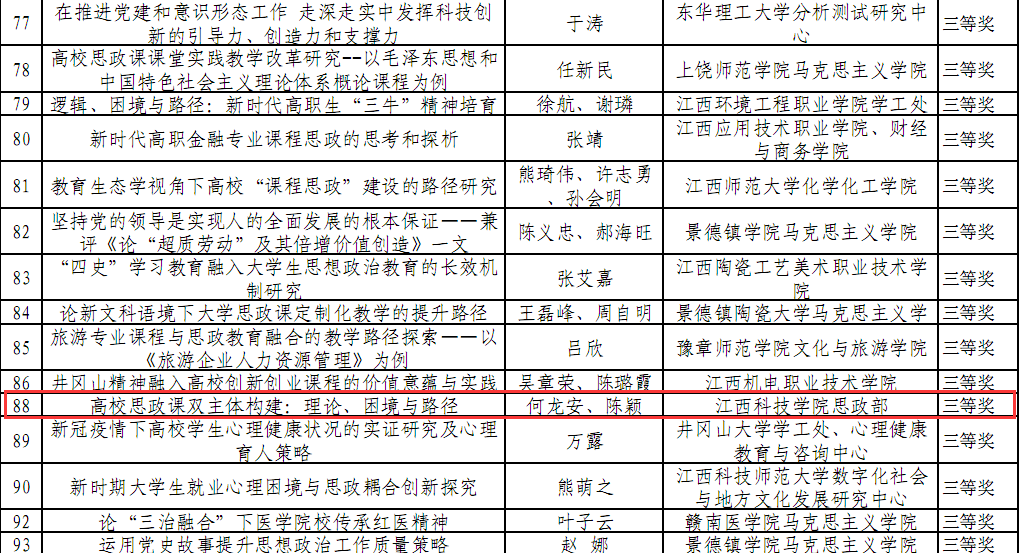 江西高校思想政治工作优秀论文征集活动由江西省教育厅组织,旨在学习贯彻习近平新时代中国特色社会主义思想,全面贯彻落实全国高校思想政治工作会议、全国教育大会和学校思想政治理论课教师座谈会精神,引导广大思想政治工作队伍围绕落实立德树人根本任务,加强工作研究、提升理论素养,切实推动高校思想政治工作改革创新。经学校推荐、知网查重、省外通讯初评、省内通讯复评等环节,最终评选出93篇优秀论文,其中一等奖21篇、二等奖31篇、三等奖41篇。