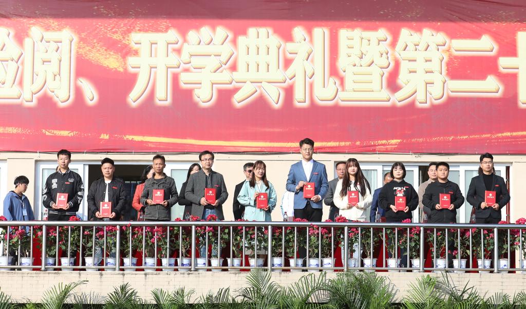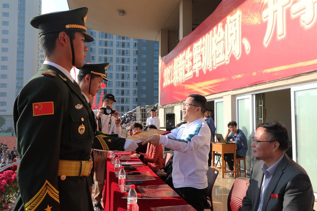 林素君副校长宣读《关于表彰2021年军训工作先进集体和先进个人的决定》。校领导向受表彰的集体和个人颁奖。
