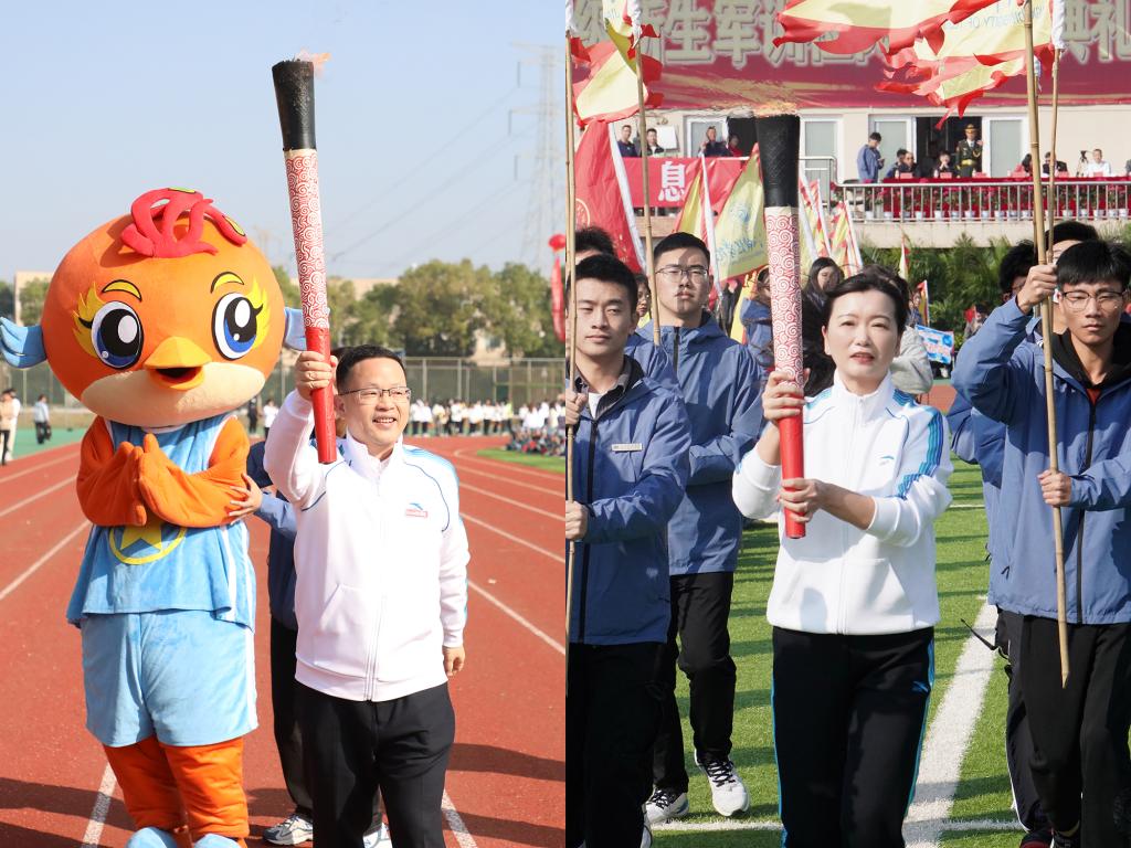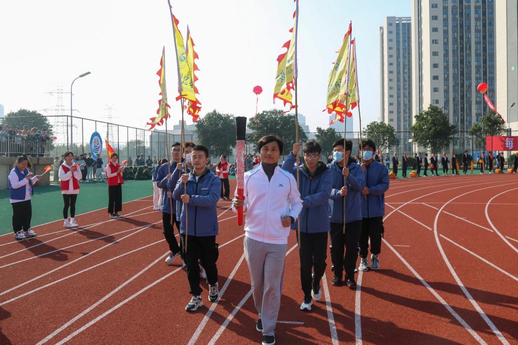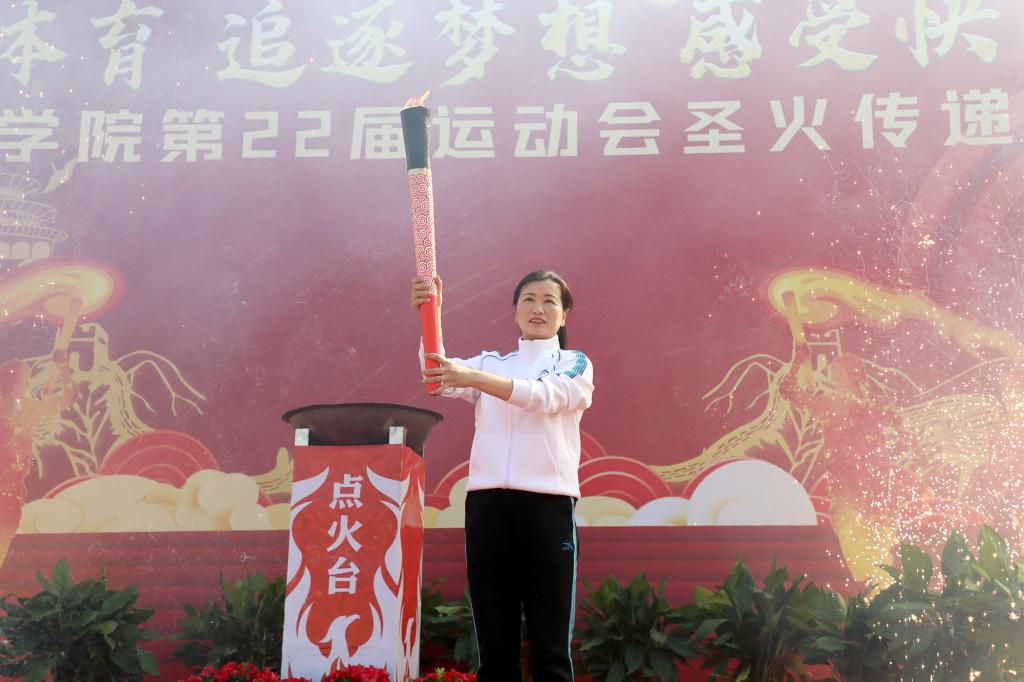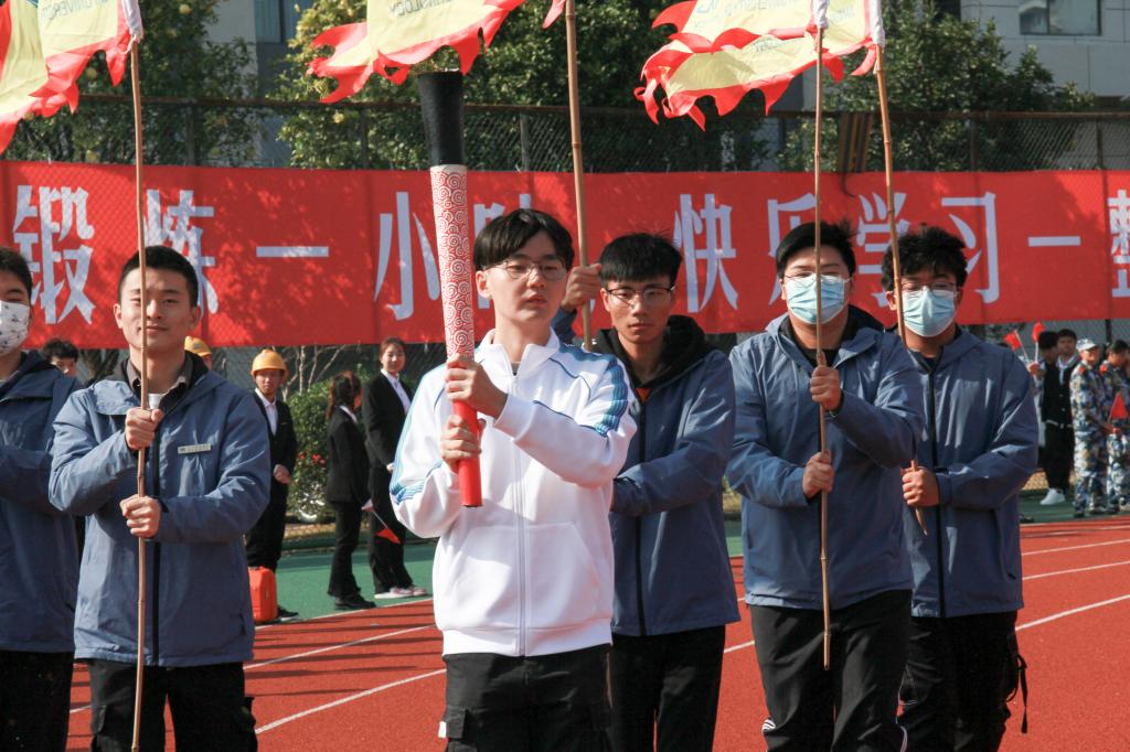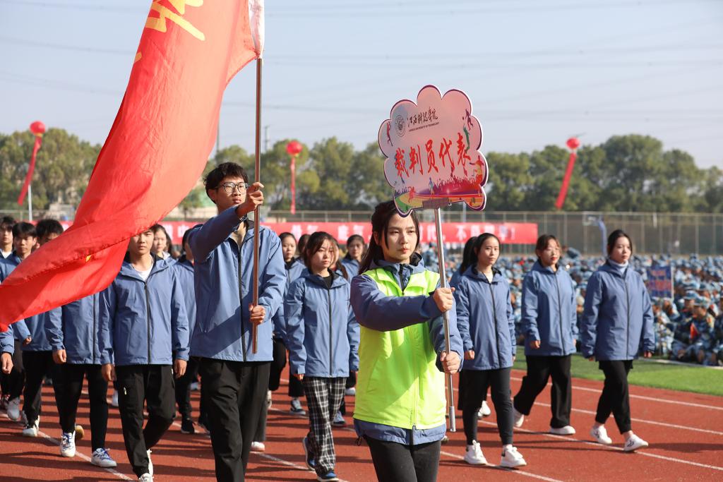 随后,学校第二十二届运动会盛大开幕。在激昂的运动员进行曲中,裁判员队伍和智能工程学院、信息工程学院、城市建设学院、管理学院、财经学院、外国语(国际教育)学院、艺术设计学院、音乐舞蹈学院、医学院、文化与传媒学院、教育学院、博雅国际学院等十二个学院师生代表队昂首阔步从主席台前经过,展现江科人青春与活力。入场式后,邓弘书记在护跑队的陪跑和同学们的夹道欢呼中,高擎火炬开始本届校运火炬传递接力。火炬依次在校领导、优秀教师代表、优秀学生代表沿奥林匹克中心跑道依次接力传递,张海涛校长接力传递火炬最后一棒,缓缓点燃国旗台前的校运会圣火。