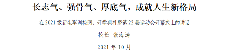 10月25日上午,江西科技学院2021级新生军训检阅、开学典礼暨第22届运动会开幕式隆重举行。校长张海涛以《长志气、强骨气、厚底气,成就人生新格局》为题在仪式上发表热情洋溢的讲话,并宣布运动会开幕。现将讲话全文刊发,以供全校师生学习。