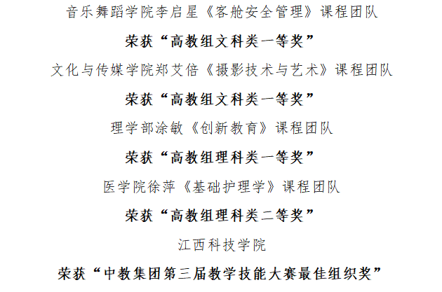 江科网讯(通讯员 秦琛)10月25日,由中教集团主办、重庆外语外事学院承办的第三届教学技能大赛圆满落幕。副校长马勇、教务处相关负责人带队参加比赛。我校共选派四名教师代表江西科技学院参加比赛。经过激烈角逐,我校共获得高教组文科类一等奖2项,高教组理科类一等奖1项、二等奖1项,学校荣获最佳组织奖。