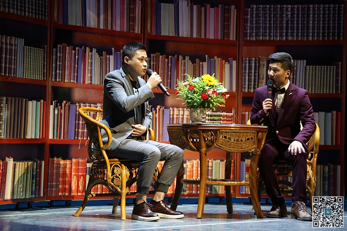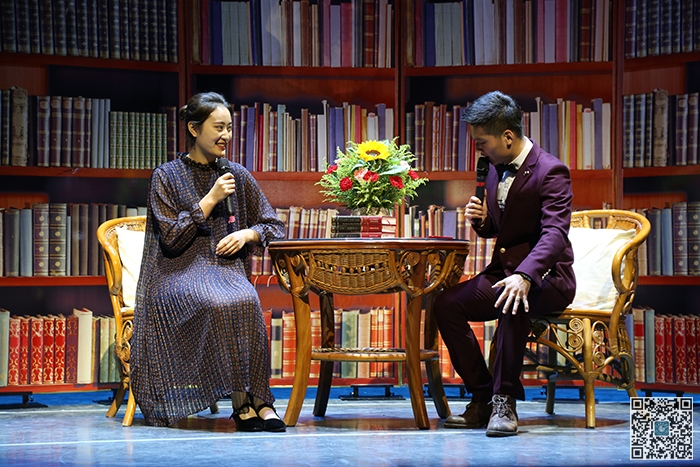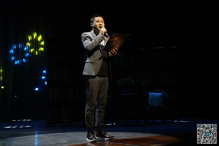 当天参与现场朗读的四组嘉宾依次是于果董事长,蓝色技术工作室学生代表魏来团队,护理学院辅导员曹晓锋,第三届全民悦诵总冠军、音乐舞蹈学院学生周冰婵,第二届全民悦诵总冠军楚克南担任主持人。