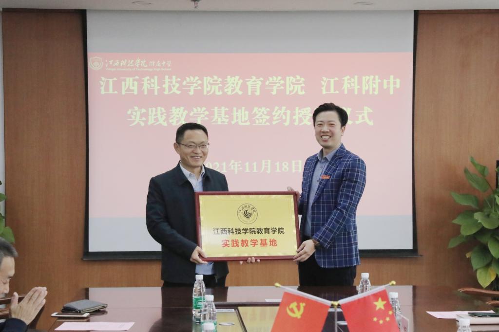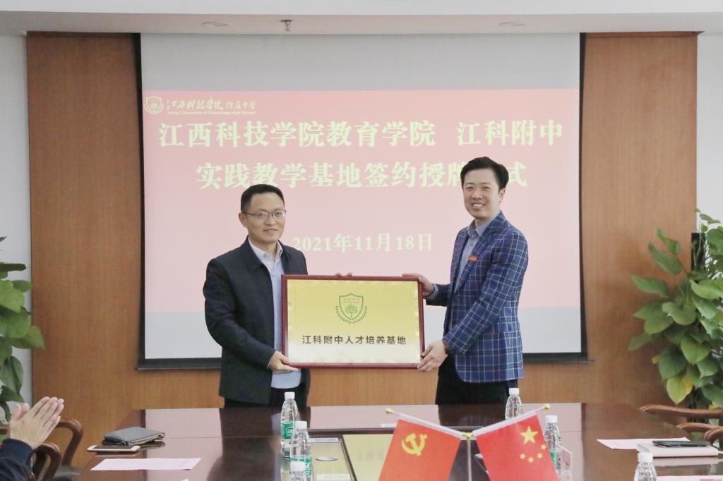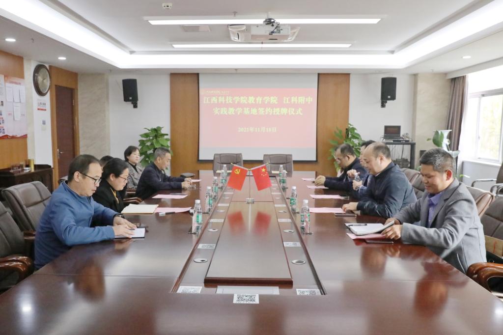 江科网讯(记者 刘莹)11月18日下午,江西科技学院、江科附中实践教学基地签约、授牌仪式在江科附中J2-218举行。我校副校长、教育学院院长李玮和江科附中书记、校长胡云翔,副校长谢弘,副书记、副校长周玉梅,中小学部主管校长周明玉以及党政办主任王志祥出席签约仪式。我校开发处、教务处、教育学院相关负责人参加仪式。