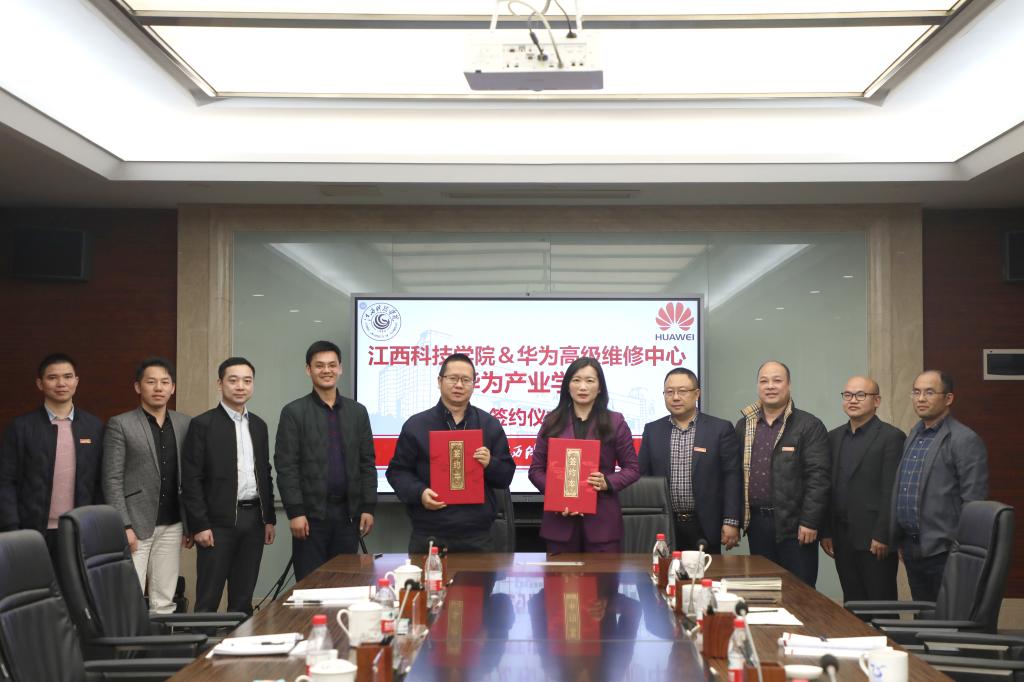 仪式上,张海涛校长代表学校与华为高级维修中心就成立华为产业学院进行签约,双方交换签约本并合影留念。