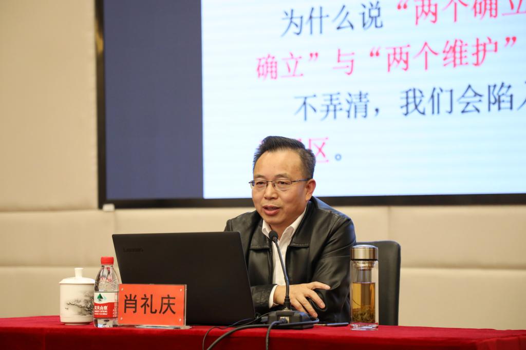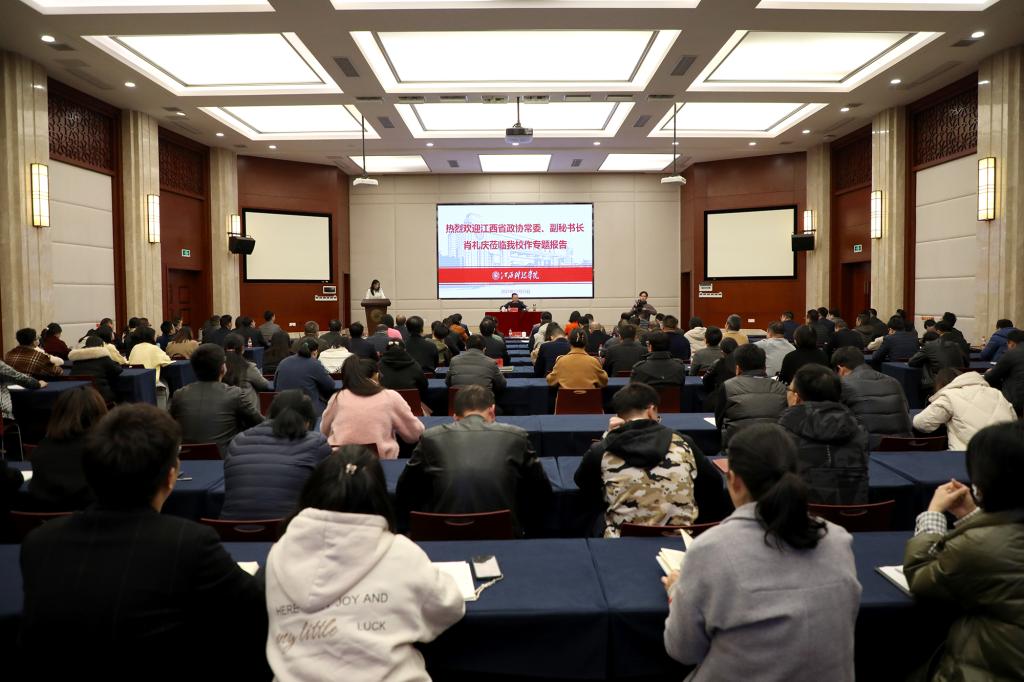 江科网讯(记者 何强江)10月25日下午,江西省政协常委、副秘书长,九三学社江西省委员会专职副主委肖礼庆受邀来校,在行政南一楼第一会议室以《历史与现实角度看“两个确立”的重大意义——学习中共十九届六中全会精神有感》为主题作专题辅导报告。报告会由校长张海涛主持。党委副书记、副校长林素君,副校长李玮、周冰冰,顾问熊爱民等在家校领导到场聆听。