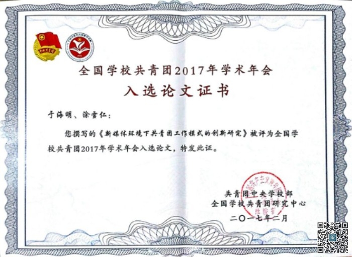 江科网讯(通讯员 涂雪仁)近日,全国学校共青团2017年学术年会在北京科技大学举行,校团委书记于海明、团干涂雪仁的论文《新媒体环境下共青团工作模式的创新研究》入选年会。