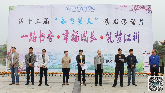 江科网讯(记者 李倩)4月7日上午,以“一路书香•幸福成长•筑梦江科”为主题的第十三届“奋飞蓝天”读书活动月启动仪式在临水广场举行。王海校长和张海涛副校长出席。各相关职能部门负责人、各学院负责人及师生代表参加了仪式。仪式由图文信息中心主任李晓宾主持。
