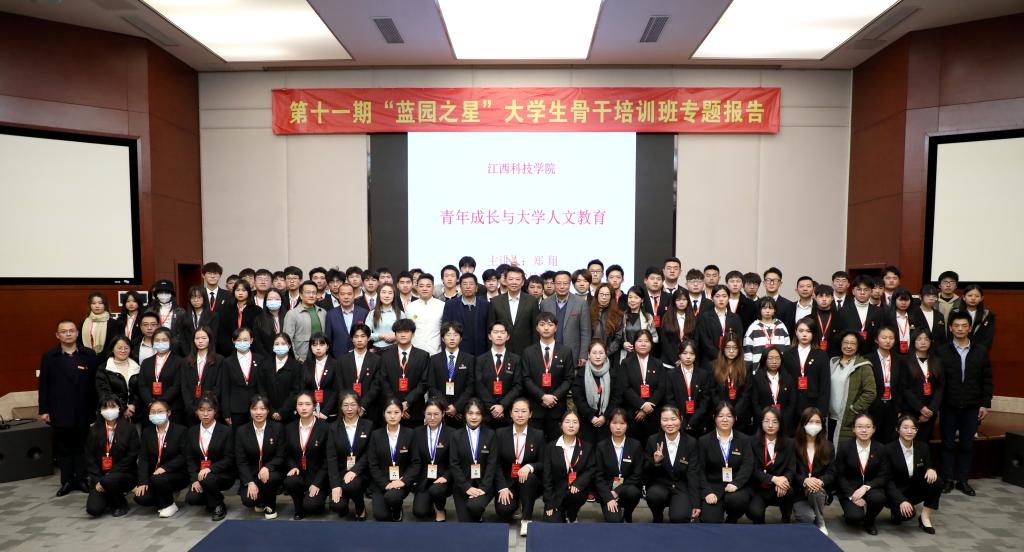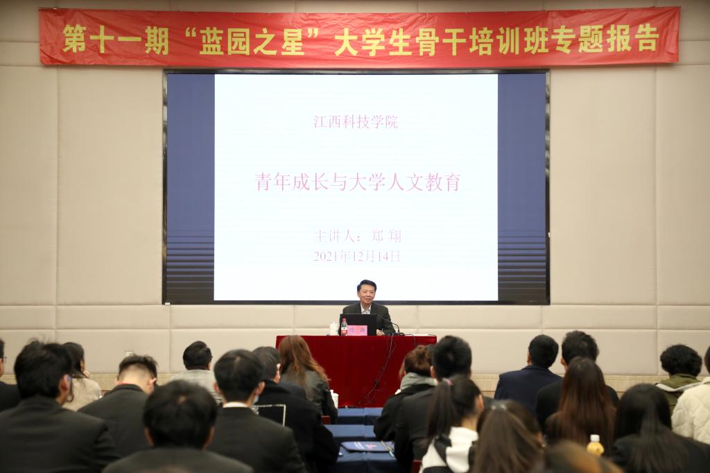 江科网讯(记者 何强江)为深入学习习近平新时代中国特色社会主义思想,充分认识与把握习近平总书记“七一”重要讲话的深刻内涵,全面贯彻落实党的十九届六中全会精神,帮助广大青年大学生更好成长成才,12月14日下午,江西省文联原党组书记郑翔应邀来校,以“青年成长与大学人文教育”这一主题向“求真湖”青年学院第十一期“蓝园之星”大学生骨干培训班学员作专题辅导报告。