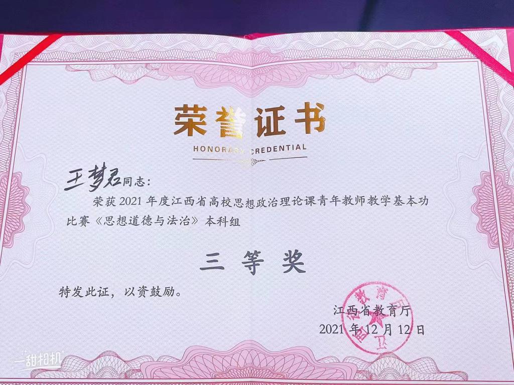 江科网讯(通讯员 潘宗秋)近日,由中共江西省教育工委、江西省教育厅主办的2021年度江西省高校思政课青年教师基本功和大中小红色文化课程教学比赛举行。我校马克思主义学院王梦君老师的参赛课程《思想道德与法治》荣获三等奖。