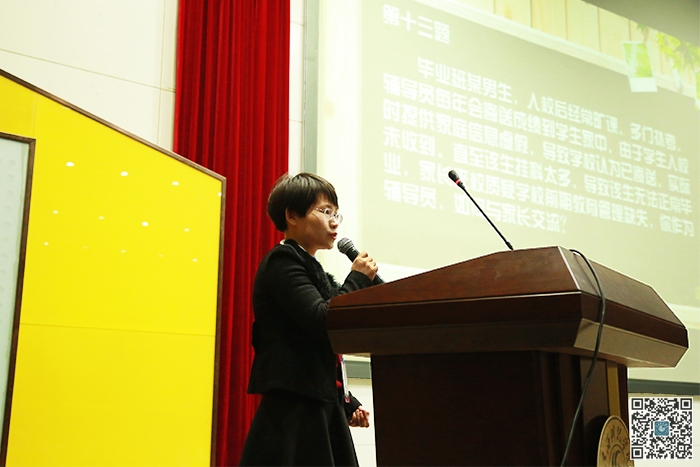 下午,案例分析比赛在报告A厅和B厅分组同时进行。比赛围绕高校学生日常生活中常见的情感问题、学习压力、宗教信仰等系列问题展开。赛场上,参赛辅导员现场抽题,结合自身工作,对案例中的问题本质、解决思路、实施办法及相关启示进行论述。