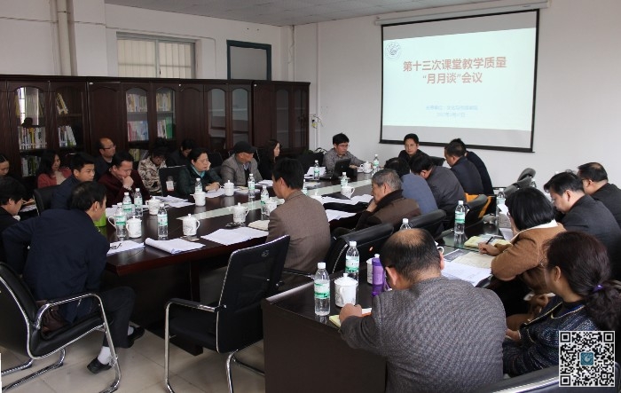 江科网讯(记者 李倩)3月37日下午,我校第十三次课堂教学质量“月月谈”工作会议在文化与传媒学院举行。胡剑锋副校长出席。督导处长何龙安、各教学单位负责人、督导员代表与会。本次会议由文传学院主办,该院齐新林院长主持。
