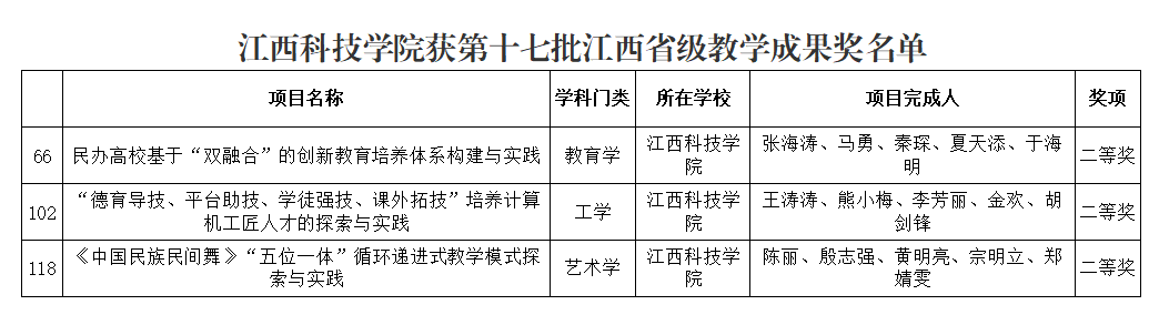 其中,张海涛教授牵头的《民办高校基于“双融合”的创新教育培养体系构建与实践》、王涛涛副教授牵头的《“德育导技、平台助技、学徒强技、课外拓技”培养计算机工匠人才的探索与实践》、陈丽教授牵头的《<中国民族民间舞>“五位一体”循环递进式教学模式探索与实践》均获高等教育(本科层次)二等奖。